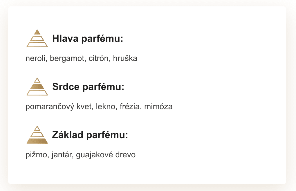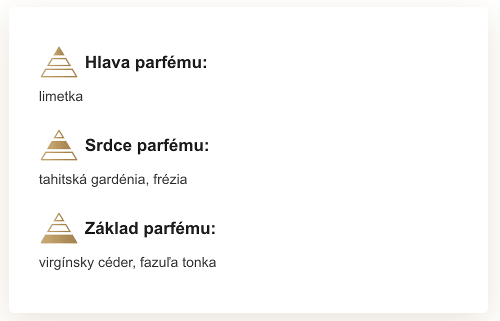 Vôňa je elegantná s kvetinovo-orientálnym nádychom. Vrchné tóny parfému sú tvorené krémovým korením, avšak najpríznačnejšie pre vôňu sú arómy vášnivej gardénie. Spolu s mystickým jantárom a pižmom ženu zahalia do tajomného závoja, ktorý muža láka k odhaleniu – k dobíjaniu srdca ženy. V našej ponuke nájdete imitáciu tohto unikátneho parfumu pod číslom 523.