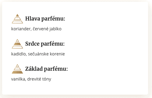 Intenzívne drevitý parfém Boss Orange vás dostane svojím uvoľneným a neformálnym charakterom. Je ľahký, svieži a spontánny – na leto priam ideálny. Spája výrazné arómy sviežeho jablka, vanilky, teplého kadidla, prenikavého korenia a exotického dreva. Tieto arómy spolu tvoria príjemnú, ľahkú vôňu vhodnú na celodenné nosenie. Obľúbia si ju najmä optimistickí muži, ktorí si vedia užívať život.