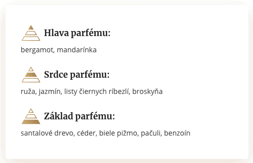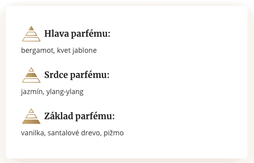 Parfum See má elegantnú kompozíciu, ktorá sa otvára vôňou bergamotu a jablkového púčiku. V kvetinovom srdci vône vaše romantické „ja“ pohladí jazmín a ylang-ylang. Záverečnú bodku vôni dodáva základ s vanilkou a santalovým drevom.